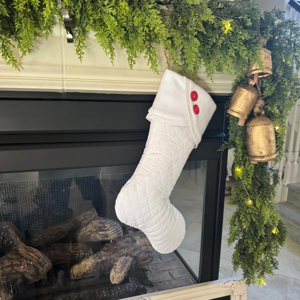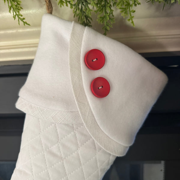 A) White quilted stocking with white fleece scalloped cuff, white trim and two red wooden buttons